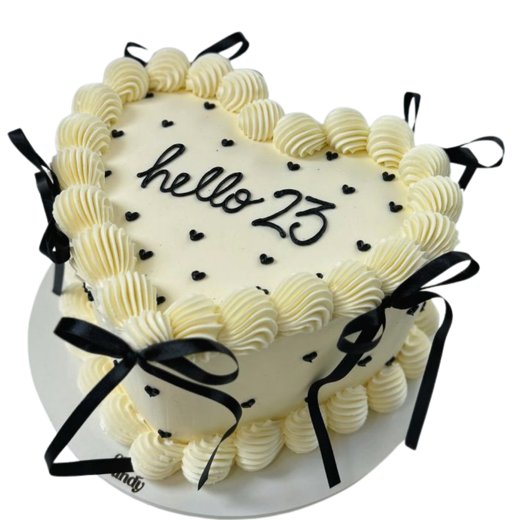 Modern Heart Cake — Heart-shaped cake with smooth cream finish, elegant piping, and modern black ribbon accents. A minimalist and stylish design, perfect for contemporary birthdays and chic celebrations.