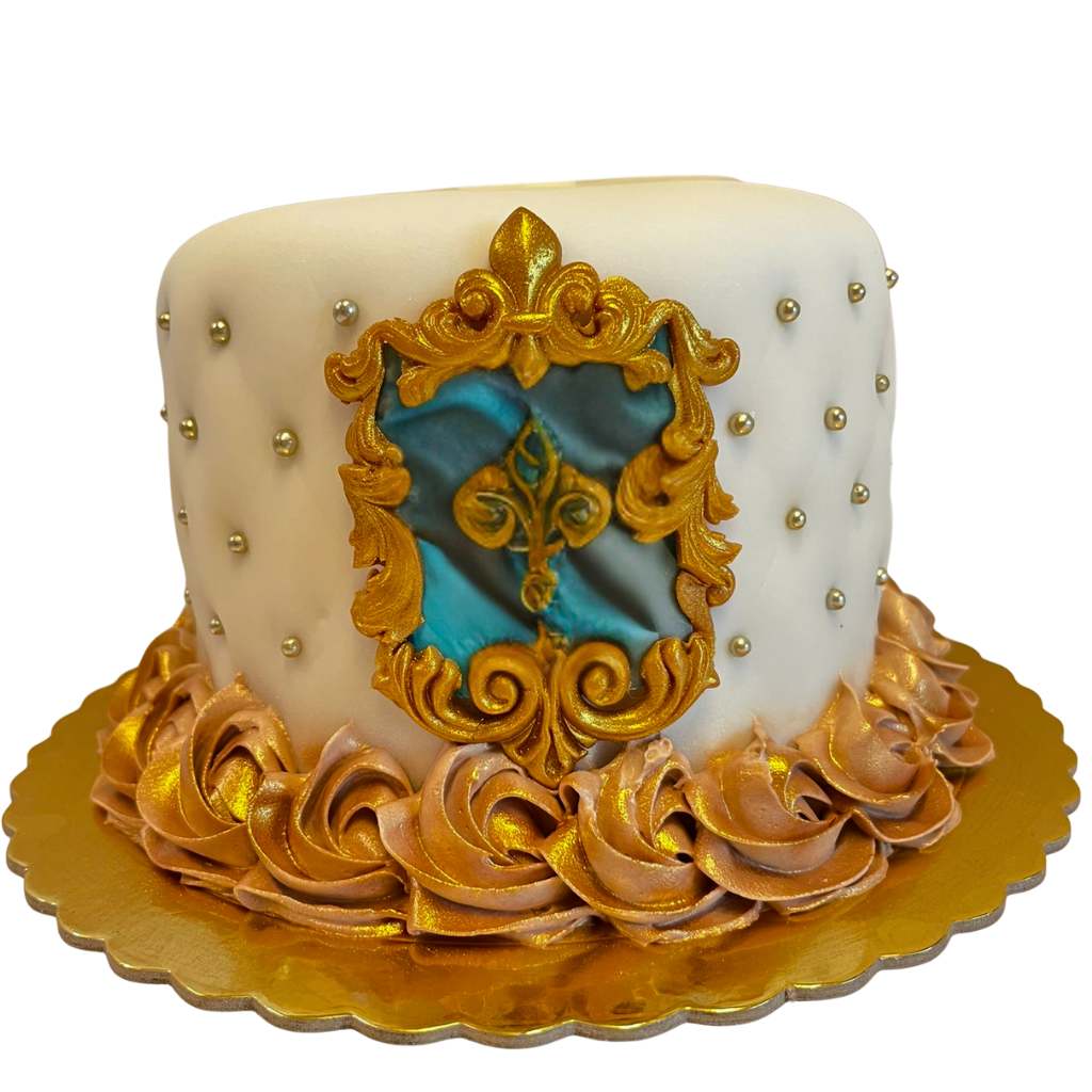 Personalized Photo Frame Cake — Elegant white cake decorated with gold accents, delicate edible pearls, and a refined ornamental frame featuring a personalized photo. A sophisticated and luxurious design, perfect for milestone birthdays and special celebrations where personalization and elegance make the moment unforgettable.